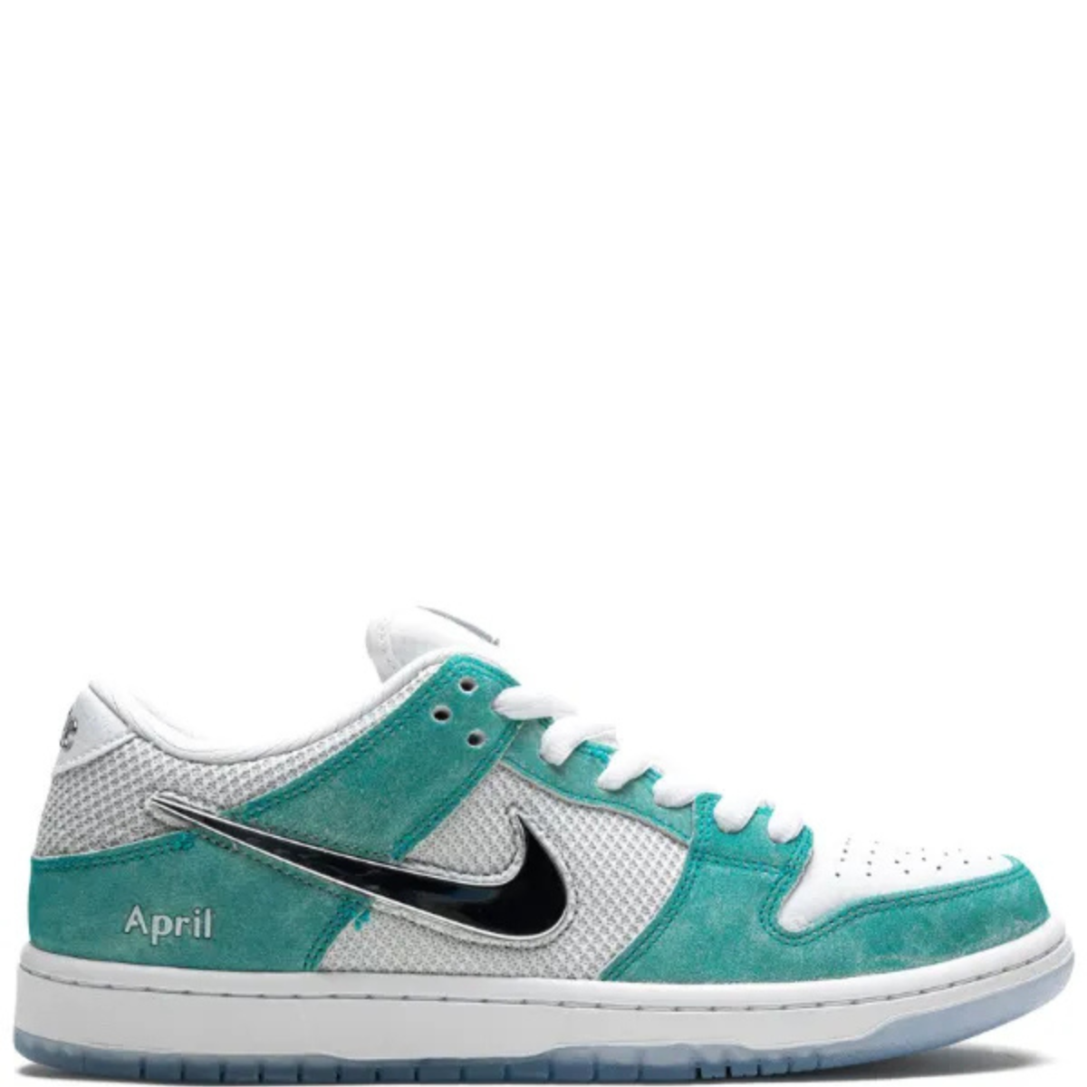 The April Skateboards x Nike Dunk Low SB ‘Turbo Green’ features this classic model with a chrome Swoosh and sturdy suede overlays in vibrant teal against an airy white mesh upper. The toe box and back tab incorporate white leather material, with alternating branding from both April and Nike SB. Beneath the sneaker, a translucent rubber outsole unveils a floral graphic. ‘April’ is imprinted on the lateral heel, while the tongue tags display a mix of Nike SB and April logos.