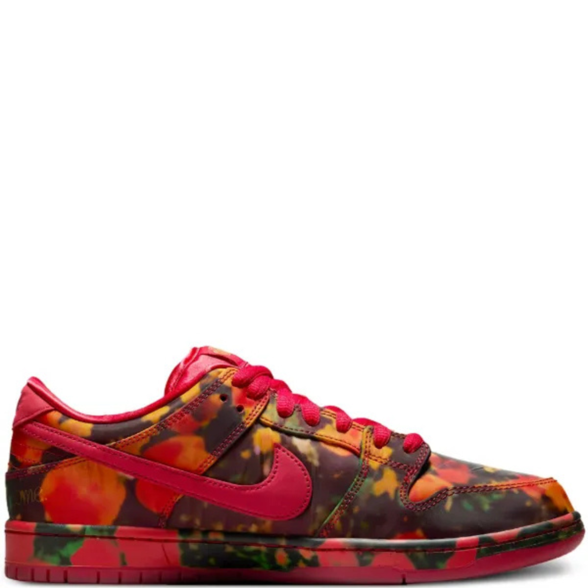 The Wizard of Oz x Nike Dunk Low SB ‘Poppy Field’ nods to the classic 1939 film. Red satin lines the upper, which is wrapped in a poppy field of Oz allover print. The silky top layer is made to be torn away, revealing a red suede surface, mirroring Dorothy’s ruby slippers. The Nike SB and ‘The Wizard of Oz’ logos star on the tongue, while ‘No place like home’ is stitched on the heel. Nike SB-branded insoles depict the Wicked Witch of the West with one of her flying monkeys. The lively poppy print extends to the midsole, anchored by a red rubber outsole underfoot.